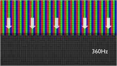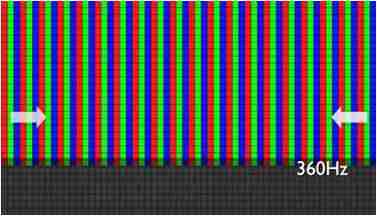 传统液晶驱动是从左到右单向进行,,,,在画面更新速度愈来越愈快的情况下,,位于驱动线路末端的右下角区域,,画素的闸极来不及在短时间内获得足够电压,,,无法显示出正确的颜色资讯。。 |